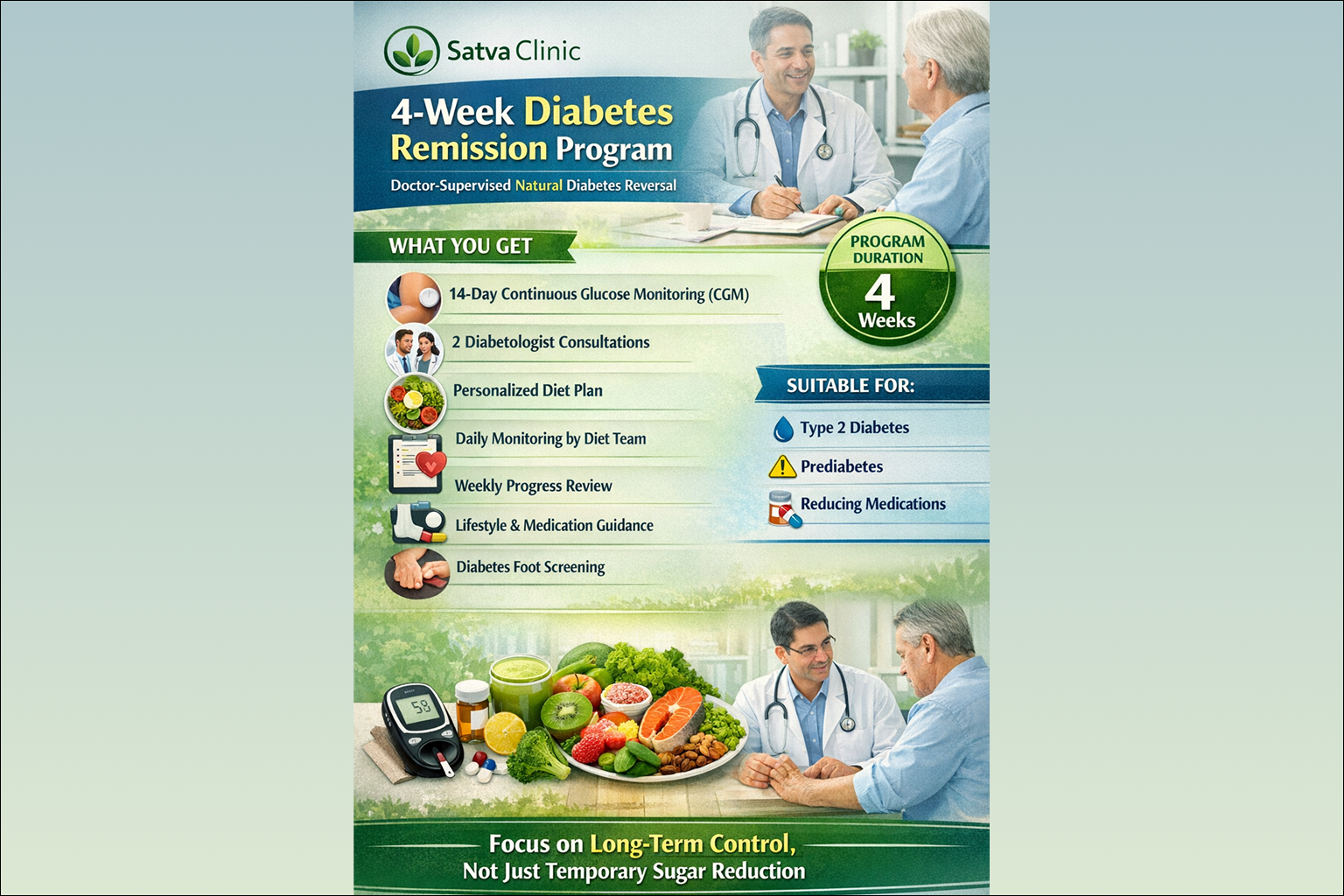 Change in lifestyle in tune with our evolution is the key to reversing many chronic lifestyle diseases. At Satva Clinic, our best diabetic doctors in Bangalore focus on comprehensive changes based on natural treatment, diet plans, and lifestyle changes. There are diabetes health checkup packages that help identify potential health problems before they become complicated. The 6 weeks program includes 6 diet consultations with continuous support through Whats App for diet advice. 4 Consultations with Dr Vishwanath B L. Consultation can be direct or online. (Blood tests and other required investigations are not included in this package)